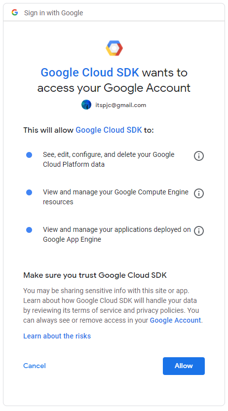 Y 를 선택하면, 브라우저로 로그인하라는 URL이 뜨는데 들어가서 자신의 GCP 아이디로 로그인 해주면 아래와 같은 화면이 뜬다. Allow 를 눌러주면 인증 끝이다.