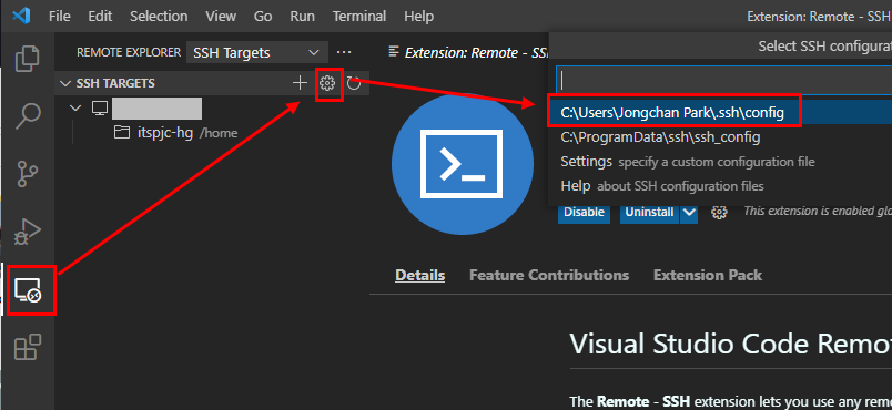 2. Remote - SSH 가 잘 설치가 되었다면 왼쪽 탭에 Remote Explorer 라는 탭이 생성된다. Remote Explorer > Configure (톱니바퀴 모양 아이콘) > SSH config 파일 선택 을 한다. 보통 C:\Users\<자신의 윈도우 유저명>\.ssh\config 에 생성된다. 나도 디폴트 그대로 진행하므로 그대로 클릭해준다.