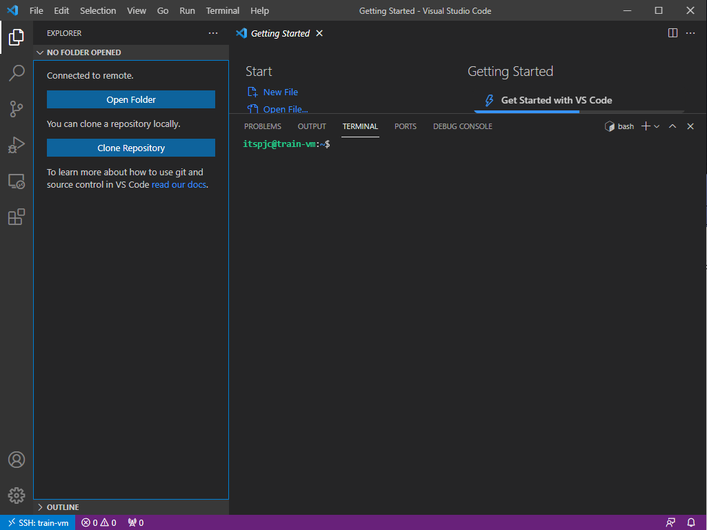 5. 연결에 다소 시간이 걸릴 수 있으나 정상적으로 연결이 되면 아래와 같은 화면이 뜬다. 왼쪽의 Open Folder 를 클릭해서 원하는 GCE 내부의 폴더를 선택한 후에 소스코드 편집을 시작해보자.