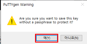 이런 메세지가 뜬다면 본 예제에서는 passphrase는 없이 진행하므로 그냥 '예'를 눌러서 진행한다.