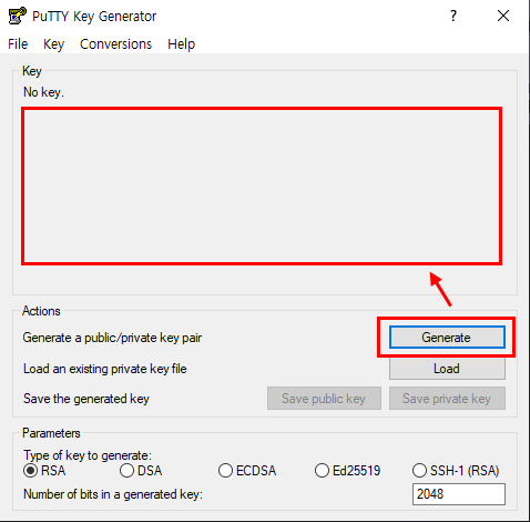 2. PuTTYgen 으로 Public / Private Key 를 생성한다. 'Generate' 버튼을 클릭하면 Key 라는 넓은 공간에 진행바가 나타날 것이다. 이 때 마우스를 이리저리 움직여주면 키 생성이 진행된다. (진행바가 왜 안늘어나지하고 불안해하지말고 마우스를 이리저리 움직여주자!)