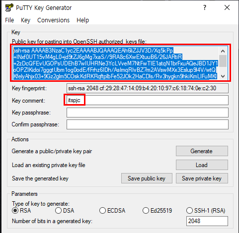 4. Public Key를 저장해줄 차례이다. 다시 한번 강조하지만 반드시 GCE의 Linux 계정명이 Key comment에 정확히 들어가야 한다. 정확히 들어가 있는지 확인해주고 Public key 내용을 복사하여 메모장 등을 통해 저장해준다. 나같은 경우는 확장자 없이 'itspjc-public' 으로 저장해 주었다.