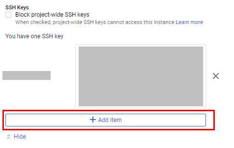 1. Compute Engine > VM Instances > 자신의 GCE > VM Instance details -> Edit 로 이동하면 SSH Keys 라는 섹션이 있다. SSH Key 가 가려져 있다면 Show and Edit 을 클릭해주면 현재 해당 GCE에 등록된 SSH Key 를 전부 볼 수 있다. Add item 을 클릭해준다.