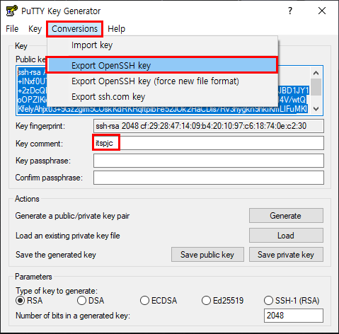 3. 이제 Private Key를 OpenSSH 방식으로 Export 해준다. 1) Key comment 에 자신의 GCE Linux 계정을 입력한다. 반드시 GCE 계정과 정확히 일치해야 한다! 2) Conversions > Export OpenSSH Key 를 눌러서 저장해준다. 나같은 경우는 확장자 없이 파일명을 'itspjc-openssh' 로 저장해 주었다.