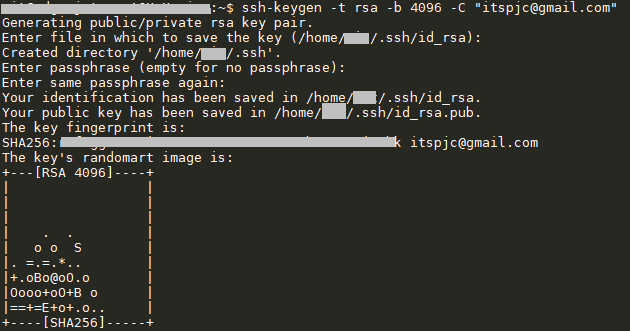 2. passphrase는 지정할 것인지: passphrase는 SSH key에 대한 일종의 비밀번호같은 것인데 입력하게 되면 해당 값을 바탕으로 SSH key를 암호화한다. 생략해도 되고 입력해도 된다. 보안을 생각하면 입력해주는게 좋지만 입력하게 되면 자동로그인과 같은 건 어렵다. 본 예시에서는 그냥 생략하고 넘어간다. 생략하려면 Enter 를 쳐주자.