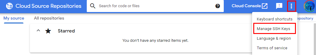 1. Source Repositories > 우측상단 점3개 아이콘 클릭 > Manage SSH Keys 로 진입한다.