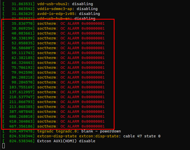 아래와 같이 'OC ALARM 0x00000001' 메세지가 뜨면 "system throttled due to overcurrent" 경고가 떳을 것이라고 유추해볼 수 있다. 여기서 OC는 'Over Current' 를 의미한다.