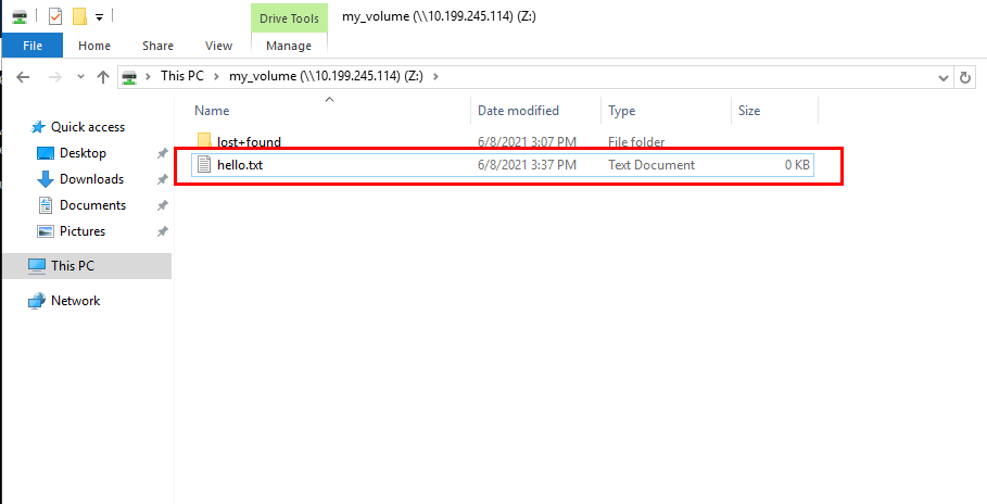 그럼 이제 서로 같은 NAS를 물고 있는지를 확인해 볼 차례다. 먼저 Windows GCE에 간단하게 hello.txt 라는 파일을 생성해서 저장했다. 이게 Linux GCE 에서 보이면 잘 연동이 된 거겠지?