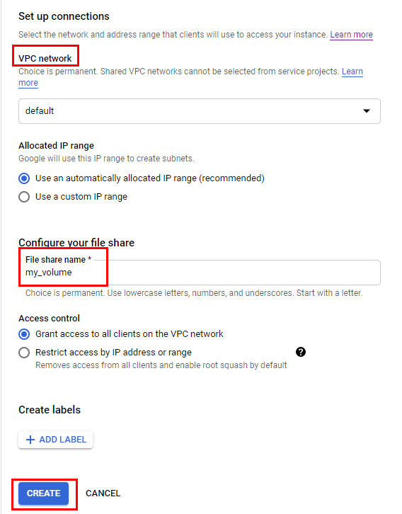 Filestore 는 같은 VPC network 에 속해있는 애들끼리만 연결될 수 있다. 즉 Linux GCE와 Windows GCE가 다르면 서로 Filestore로 묶일 수 없다는 거다. 진짜로 그런지 일부러 다른 VPC에 속하는 애들끼리 Filestore에 묶이나 테스트 해봤는데 역시 연결이 안됐다. 미리 Linux GCE와 Windows GCE가 같은 VPC Network에 속해있는지 확인하자. 그다음 File share name 도 정해준다. 흔히 NAS에서 말하는 볼륨이름이다. 다 정했으면 CREATE 클릭해서 완료해준다.